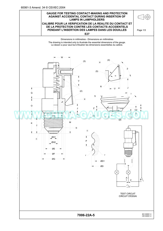 E27 Gauge for Testing Contact-Making and Protection Against Accidental Contact During Insertion of Lamps in Lampholders 7006-22A-5