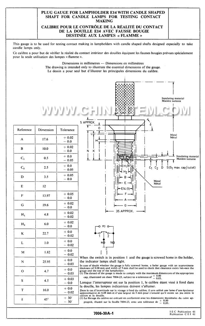 IEC60061-3: 7006-30A-1 E14 Plug Gauge for Lampholder with Candle Shaped Shaft for Candle Lamps for Testing Contact Making